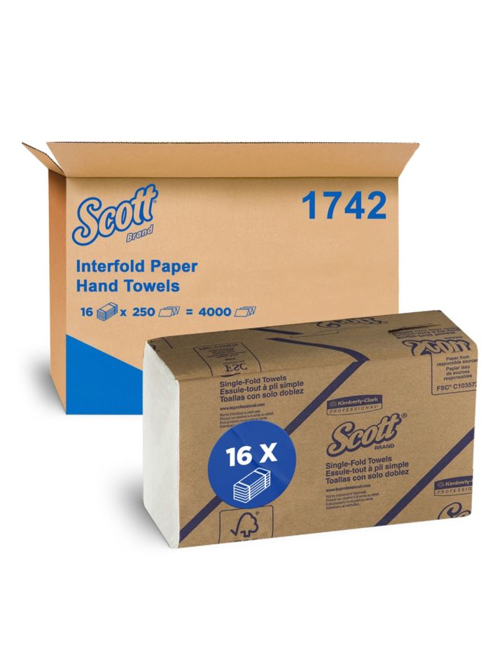 SCOTT® Interfold Paper Towels (1742), Folded Hand Towels, White, 16 Packs / Case, 250 Hand Towels / Pack (4000 Hand Towels)